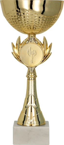 Klasyczny puchar w złotej tonacji. Metalowy kielich pozbawiony zdobień podkreślający sportowy charakter nagrody. Możliwość umieszczenia wklejki w centralnym punkcie. Dzięki zwężeniu w środkowej części trzonu puchar idealne układa się w dłoni.