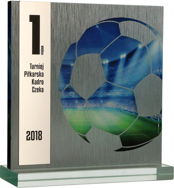 Trofeum szklane z nadrukiem kolorowym LuxorJet, grawerowaniem oraz wypełnieniem farbą i etui