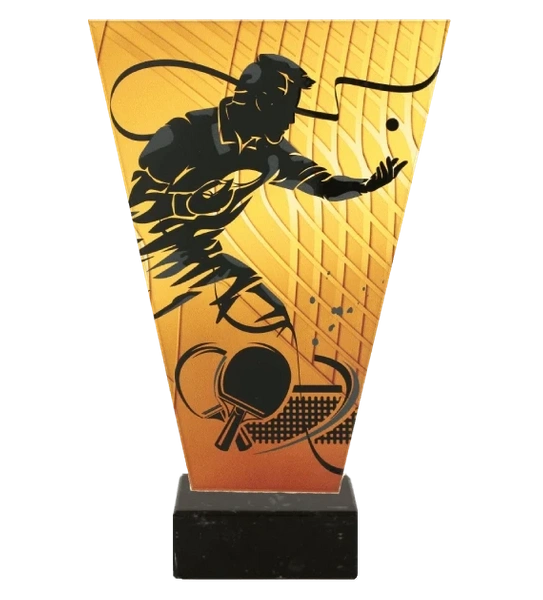 - Szklane trofeum z motywem tenisa stołowego.