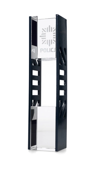 - Statuetka wykonana z metalu, drewna, plexi i szkła o wysokości 25cm oraz szerokości 14cm. Przeznaczona do nagród związanych ze służbą w Policji.