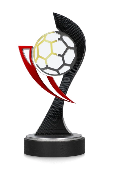 - Statuetka wykonana z drewna i metalu o wysokości 25cm oraz szerokości 11cm. Przeznaczona do nagród piłkarskich.