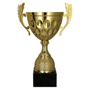 - Złoty, metalowy puchar o klasycznym wyglądzie z uszami z motywem roślinnym. Uniwersalny design pozwala uhonorować zwycięzców różnych dyscyplin. Puchar występuje w różnych wysokościach.