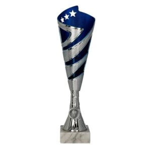 - Srebrno-granatowy puchar spiralnie zdobiony kielich z trzema gwiazdkami u góry. Jego detale nadają mu nowoczesny wygląd. Puchar wysokości 38 cm