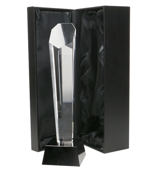 Szklane trofeum o wymiarach 30x5cm i grubości 4,5cm.
