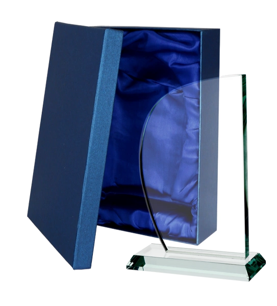 - Nowoczesne trofeum szklane o eleganckim wyglądzie. Posiada estetyczną formę i transparentną powierzchnię. Trofeum o wymiarach 21x12cm i grubości 1,5cm.