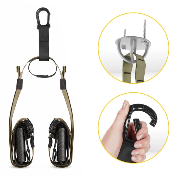 - W zestawie: taśma z karabińczykiem, 2 x taśma z uchwytem, uchwyt na drzwi, woreczek